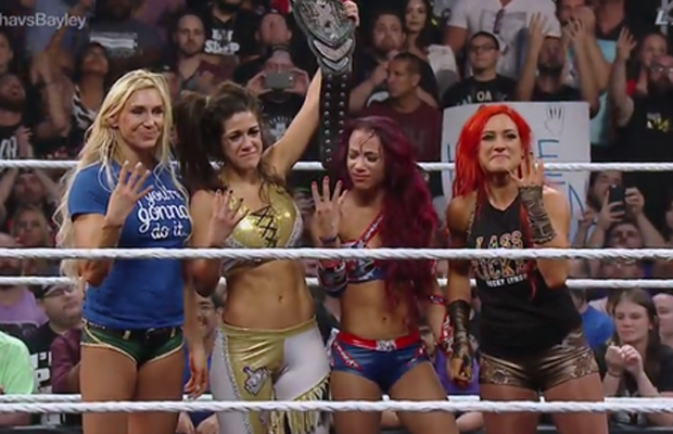 Post-match, an emotional Bayley was joined in the ring by her fellow Four Horsewomen, Charlotte, Becky Lynch and Sasha giving her a group hug as the jubilant crowd congratulated the new champ.