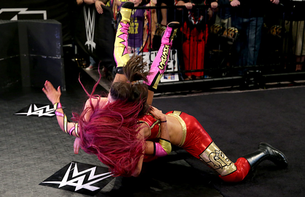 Dana eventually frees herself, but she’s quickly blasted with a kick to the chin. Emma gets on the ring apron, but Asuka disposes of her quickly and kicks Dana in the face. Asuka then locks in a crossface chickenwing bodyscissors: the Asuka Lock! Dana is trapped, and she has no choice but to tap out!
