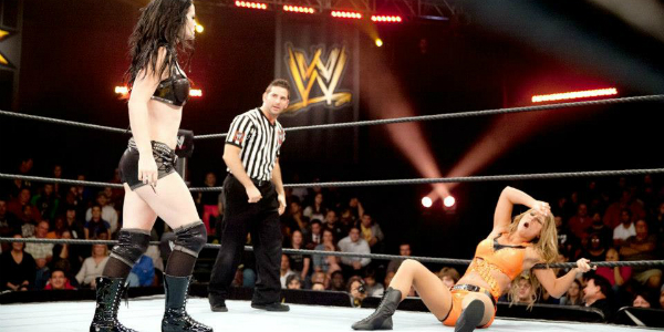 Emma’s music is sadly cut off, which seemingly gets the same reaction out of her as it does from me. Before we can complain though, the rock beat of the enchanting Raven haired lady strikes, as the crowd goes crazy insane. This can only mean one thing… Paige! Paige fast walks her way down the ramp and lets out her trademarked screech before removing her coat and stepping into the ring. The bell sounds and we kick things off with a “Paige” chant, as she throws Emma around by the hair. Following a scream, Paige begins stomping Emma on the chest, then proceeding to attempt an Irish Whip that Emma counters into a kick to the knee.