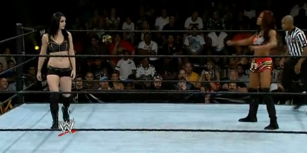 Alicia Fox stands in the ring already, as Paige makes her grand entrance from the back. Once inside the ring to some monster “Paige” chants, the bell sounds and this match gets underway. They lock up, as Fox scores with a takedown. Paige reverts into one of her own, as the fans get behind this black haired Brit. Alicia with a waist lock, before Paige counters and gets a roll up for a two. Paige then executes a nice backslide, followed up with a small package, and then a flip roll up — all for two counts. Both women get back up, but Paige shrieks at Alicia and amazingly makes the Fox fall back in fear. They then exchange slaps, as Paige scores with some sick shots. Never one to be outdone, Alicia drills Paige with a tilt-a-whirl backbreaker, as the Fox takes control of this match.
