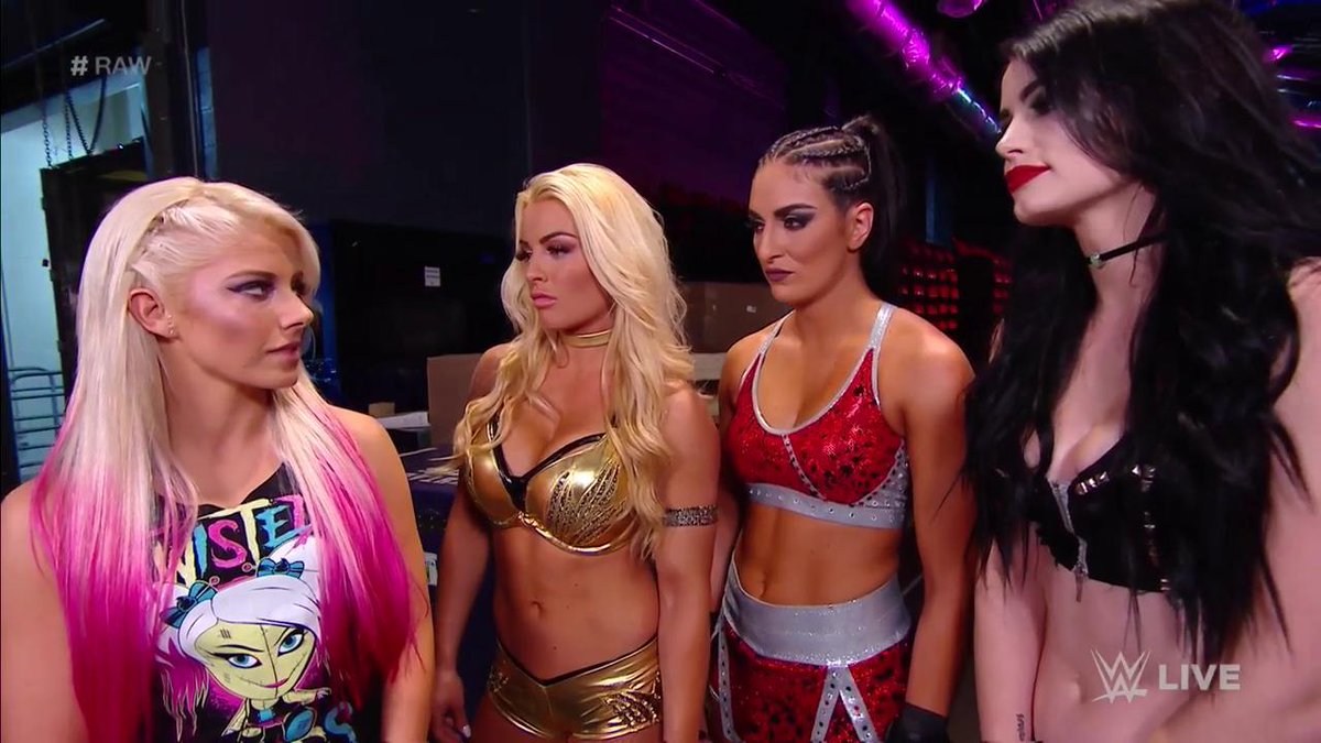 During the Fatal 4-Way match, Paige’s music hit and she took the mic to ask the WWE Universe if they missed her. Paige continued by announcing the she was officially back but that she wasn’t alone. As Paige was heading to the ring, NXT Superstars Mandy Rose and Sonya Deville ran in to attack and clear the ring of Fatal 4-Way contenders with Paige alongside them.