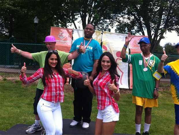 Brie and Nikki Bella lent a hand today at a Special Olympics event in New Haven, Connecticut, awarding competition victors with medals and congratulatory hugs.