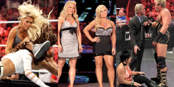 This week we’re kicking things off with our Diva match and surprise, surprise… it was filled with a little bit of controversy. Earlier in the evening it was announced that Brie Bella would be taking on Eve Torres in a singles match, but in all actuality it was Nikki who wrestled tonight. She took on Eve, who had her Diva’s Champion BFF, Kelly Kelly, with her. Nikki and Brie were in the ring when Raw returned from break, and Eve and Kelly walked onto the stage.
