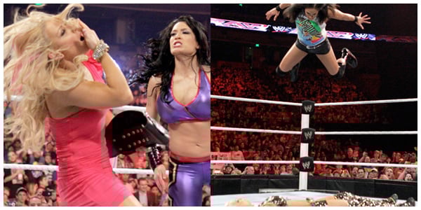 For the most part, the men worked this match, but at the end of the match we finally got to see Maryse and Tamina in action. After taking down DiBiase, Santino prepared to finish him off with the Cobra Strike. Little does he know, Ted has tagged out and Maryse has taken his place. Santino turns around and sees Maryse, who turns Santino’s ‘cobra’ against him. While Maryse showboats, Tamina jumps in the ring and takes Maryse out with a superkick (or an attempt at one, at least), followed by a Superfly Splash for the win.