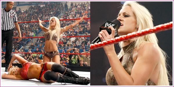 Maryse starts the match, as she has most of her matches, by taunting Kelly. Kelly responds (as most of Maryse’s opponents have) by tossing her around, taking advantage of the match. Maryse eventually turns the tables, latching herself and Kelly in a hair-pulling trap. She breaks it with the punch to the head, and proceeds to taunt Kelly, leading to another flurry of offense by Kelly. She clotheslines, dropkicks, and caps it off with a cross body into a pin attempt. Maryse kicks out at two and takes refuge in the corner. Kelly attem
