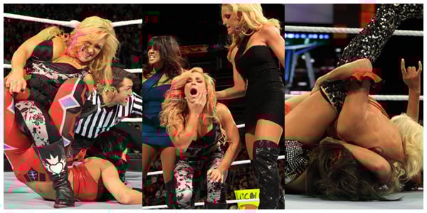 While the referee and Maryse are distracted, Nikki rolls Brie out of the ring and takes her place.Maryse returns her attention to who she thinks is Brie Bella and goes for the French Kiss. Nikki manages to reverse into a small package and picks up the win, while a not-so-happy Brie looks on outside.