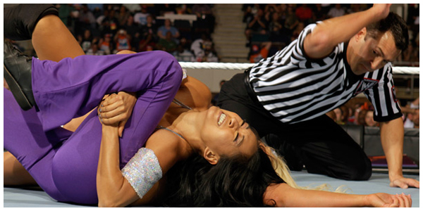 Jillian again applies a submission move, driving her knee into Gail’s back. The referee breaks up the hold and Gail tries to fight back but isn’t strong enough. Jillian whips her into the corner and Gail takes a pretty nice bump, falling to the canvas.