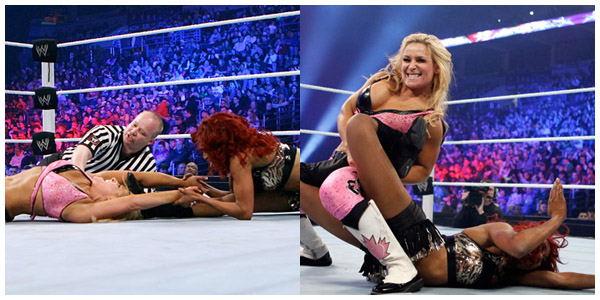 Ms. Fox attempts to gain the upper hand with a leg scissors submission, forcing the babyface Diva to break her iron grip. Natalya nips up, pulling Alicia into a headlock once again, a move that forces the once self-described piranha to fight harder, eventually elbowing Natalya in the gut before Irish-whipping her into the ropes. Natalya comes rushing back with a hard shoulder block. The pink and black Diva heads for the adjacent ropes, running towards a grounded Alicia, who misses her by a hair. Alicia returns to a standing position as Natalya bounces off the opposite ropes and heads for the foxy one once again. The two display impressive acrobatics as Natalya runs back at her opponent, rolling to the opposite side and Alicia jumps several feet in the air to miss her once more. The two, now standing a mere distance from each other, rush back to the center of the ring and at each other. Natalya tries to lock in the Sharpshooter but the resourceful former champion puts up a struggle and reaches the bottom rope, a slick move that forces the third generation Diva to reluctantly pull back.