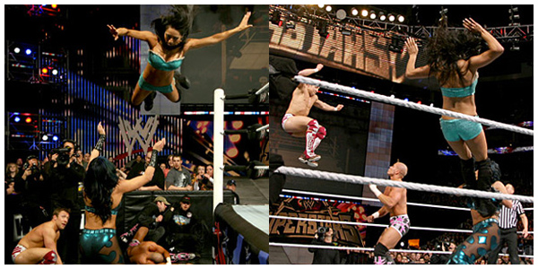 Fast forward some wrestling between the men. DB has a LeBell Lock cinched in on Kidd who rolls out of the ring. Melina, standing up for her partner, steps in, yelling at Bryan before slapping him viciously across the face. Gail runs in and dropkicks her in retaliation. Bryan steps onto the apron and sends himself flying with a knee to the chest on Tyson Kidd. While Gail jumps off the top turnbuckle onto Melina with a flying crossbody to the outside. She stands up, jumping excitedly into her man’s arms. Scott Stanford announces a commercial break as Gail walks back to her corner and Bryan goes for Kidd’s prone body on the outside.