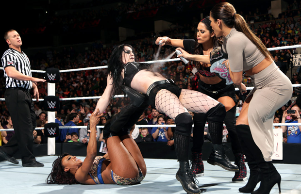 Alicia attacks Paige after the match, allowing the Bellas to enter the ring and spray some form of tanning lotion onto Paige. Is that what fake tan looks like or was that just a really bad WWE prop?