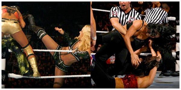 As expected, Bryan picks up the win over Kidd and Gail joins him in the ring to celebrate. The Bella Twins interrupt their party and one of them even shoves Gail. Of course she retaliates by shoving said Bella half way across the ring. Yikes! At this point, all hell breaks loose. I honestly thinks that this fight falls under the category “Ghetto Brawl”. I don’t know if The Bellas and Gail have any real animosity towards each other but these fights are sure making me believe they do. While the concept of a bunch of women fighting over a man is a little iffy for me, I have to say I’m enjoying these brawls. Hopefully, we can finally see them face off against each other in the squared circle. However, for that to happen, Gail would need the a partner to help her fend off the twins. Hmmmmmm…