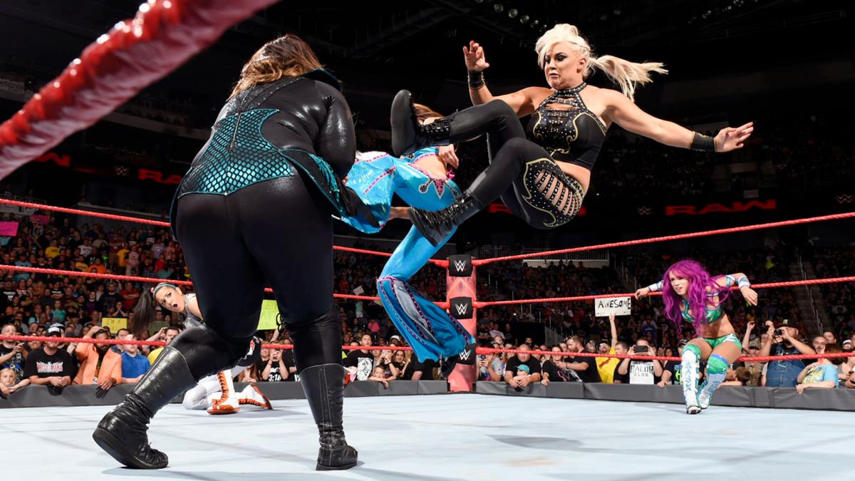 It’s far from over though! An angry Nia shoves down Emma, but then gets jumped by Sasha! Alexa helps to knock Sasha off and she soon comes face to face again with Emma. In a slight twist, the two start stomping all over Sasha! That’s until back-up arrives in the form of Mickie James and Dana Brooke! They attempt to even the odds, but Nia Jax wrecks through them all.