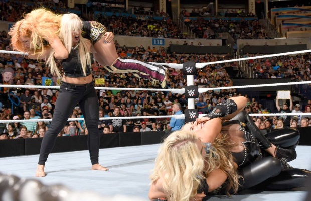 Then ensues some of the worst acting I’ve seen in a while. Dana is “deep thinking” but instead looks like how a confused old woman would when lost in the street. She just stared blankly at the sky. Anyway, it then looked like Dana would walk away from Charlotte, but she attacks Natalya instead. Becky then falls over Nattie and the whole thing is not exactly smooth. They tried at least. Some of the dialogue and delivery was decent.