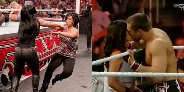 Vickie starts berating her (thankfully not with shovels though), and the two come chest to chest! Vickie piefaces Aksana, which is just enough for her to spear Vickie to the ground and emerge in a catfight! They roll around the ring beating the ever loving tar out of each other until the five men inside the ring are able to separate them! Dolph and Jack pull Vickie out of the way, as Kofi and R-Truth help to maintain Aksana’s composure. I’m all for Aksana and Vickie being added to the 12 person WrestleMania match!