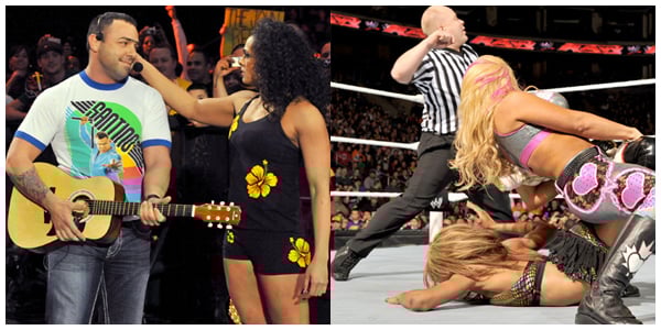 Santino Marella makes his way down the ramp with guitar in tow, looking to return Tamina’s serenade from last week. Maryse and Tamina jump down from the apron, leaving poor Alicia stranded in the ring. After some awkward staring between Tamina and Santino, Tamina grabs her man and essentially drags him backstage, leaving Maryse standing there open-mouthed.