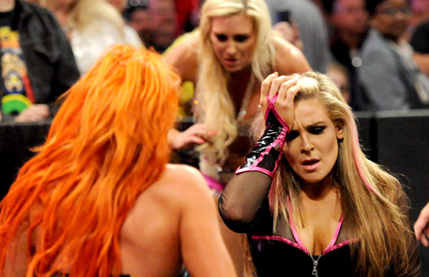 Nikki is tagged back in now and her and Brie hit a double team combination that lead to Becky flat on her back again. Another double happens shortly after as both Becky and Nikki clothesline each other at the same time. Becky manages to then tag in Charlotte and Paige looks irate!
