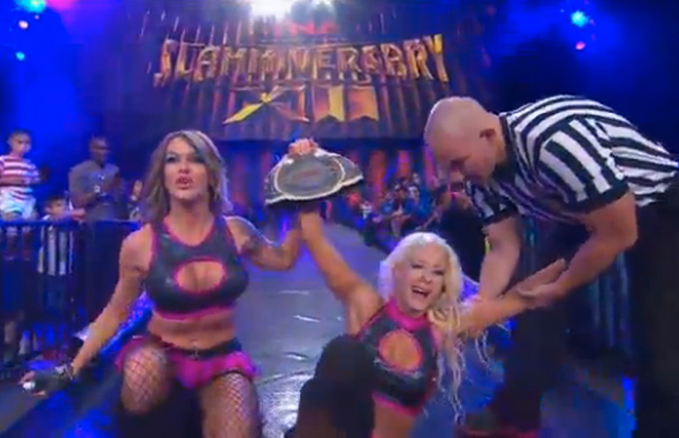 Tonight at Slammiversary two referees, Velvet Sky and a few dirty tricks allowed Angelina Love to retain the Knockouts Title.