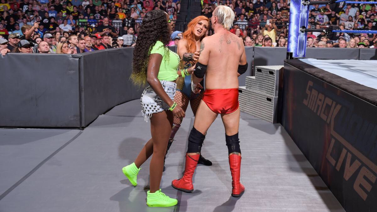 The match itself was similar to last week. Ellsworth didn’t lay a hand on Asuka and tried to run away every chance he got. Before the match started he warned the lumberjacks that his lips are off limits even though he knows he is tempting. Corey Graves mentioned how all the ladies in the audience screamed when Ellsworth took his shirt off.