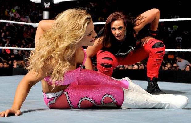 Natalya elbows her way out of it, but before she can be free, Tamina slams her to the mat, probably giving her some epic whiplash. She drives a knee into Natalya’s back and goes for another pin, but it isn’t enough to seal the deal.