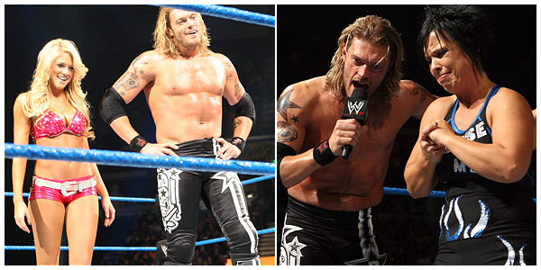 Edge and Drew are ready to start the match off, but Kelly is bouncing around on the outside. She holds out her hand and Edge gleefully makes the tag. Drew has no choice but to get out of the ring, and Vickie has no choice but to enter. She’s hesitant to say the least but she finally gets in. Kelly and Edge get the crowd solidly behind their team and Vickie shoves Kelly back. It doesn’t phase the blond bombshell. She actually wants to know if Vickie is serious. The SmackDown Consultant attempts a kick, but Kelly catches her by the foot and sends her down. Kelly wastes little time in going to town on Vickie. She jumps on top of her and begins knocking her around. The ref has to pry her from Vickie and that allows our favorite heel to scramble away and tag Drew in.