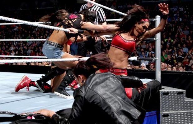 Brie gets involved and ends up getting inadvertently launched from the apron by her sister. AJ takes advantage of the distraction and locks in the Black Widow, forcing Nikki to tap out.