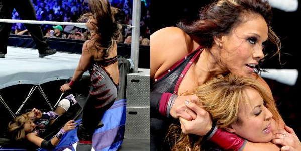 Layla then basement dropkicks Tamina for good measure and looks to go for a crossbody next, but as she runs off the apron, WHACK! Tamina proves that she is craftier than Albert Einstein (well, maybe not) and pulls the ring skirt away from the apron, causing Layla to slip and crack her back right off the apron. Tamina stomps Layla’s back against the solid steel apron before sliding her into the ring. Tamina then works over the neck of Layla with a sleeper (the neck is connected to the spine, so I guess that’s sound-ish strategy) as the crowd begin to chant Layla’s name and get behind the English export.