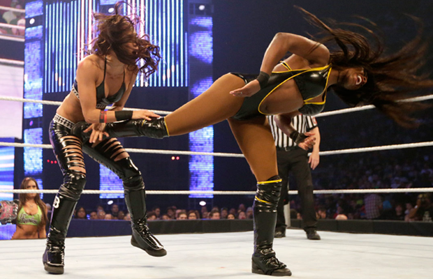 Naomi is on a roll, ducking an attack from Brie and running the ropes, hitting her somersault clothesline on the return. Her Irish whip into the corner is reversed, though, and Brie comes charging. When Naomi tries to block her, Brie catches her boots, tossing them over the top rope. Naomi keeps her balance, though, and gets the last laugh, kicking Brie in the side of the head.