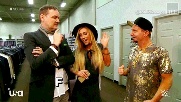 A scene between Carmella and James Ellsworth is shown and it appears to be of their shopping trip from last week! ‘Mella doesn’t seem to be too fond of Ellsworth’s fashion sense, but after a ton of different outfits, she finds one that’s perfect for him… And it seems he looks a lot like her…