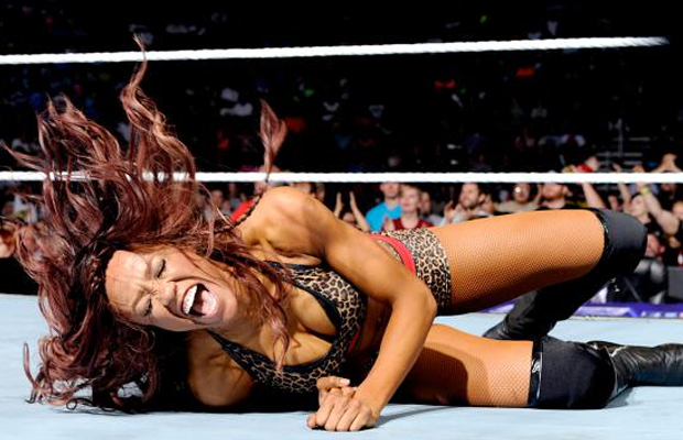 Alicia goes to get back in the ring, but when Natalya approaches her she starts hissing like a rabid cat, much to my delight. Unfortunately for Alicia’s hissing gets her two slaps to the face and Nattie rolls her up for a nearfall. Now with the advantage, Nattie gets a bit flashy with a neckspring, but Alicia has her scouted and chokes her out over the bottom rope, prompting the official to intervene.