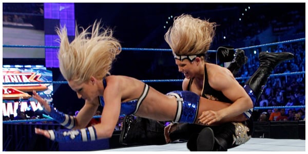 We kick off the match with Phoenix and Layla. Layla attempts to fight the powerful Glamazon with some kicks to the legs but Beth picks her up with great ease, hoisting her in the air for an airplane spin and drops her back down to the canvas. This leads to a really funny moment with Layla, who is easily the best comedienne among the Divas, trying to make a tag to her tag team partner [“Ohhhh Michellllllllle”] only to find out that she’s in the wrong corner. As she gathers her surroundings, she walks right into a clothesline from Phoenix who then tags out to Tiffany.