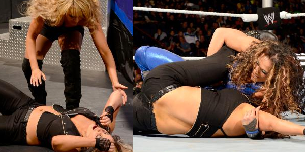 Kaitlyn rolls to the floor, prompting Layla to come to her aid. Unfortunately for Layla, Tamina isn’t having any of that and shoves Layla and her good intentions to the ground. With Layla out of the way, Tamina sets her sights on Kaitlyn once again, but Kaitlyn fights out of her grasp and throws her into the ring.