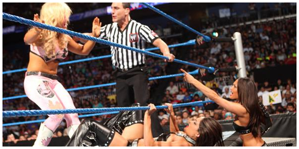 Natalya seems shock that she wasn’t able to get the pin, so she decides it’s time to put Brie away. Brie goes for the ropes and Natalya follows her. She begins pounding away on the champ in frustration and Nunzio is forced to make Natalya back up. Natalya forces her way past him and goes for Brie again, who once again sticks herself between the ropes. Nunzio has to physically restrain Natalya and that gives the chance she’s been waiting for. She cheaply kicks Natalya in the knee, which drops the powerful Diva down. Then she throws Natalya into the turnbuckles. Natalya cries out in pain and that gives Brie the chance to hit her finisher. She gets a clean victory over the former Divas Champion and Nikki climbs into the ring to celebrate. The twins embrace each other and Brie basically looks like a million bucks going into Over The Limit.