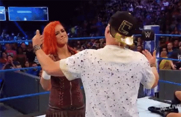 The Welcoming Committee, or, “Nattie and the Pussycats” as some readers describe them as, quickly attack Naomi and Flair. Despite their efforts, the numbers game works out well for Natalya and co. and they dominate the scenario. But before we know it, the Lass Kicker Becky Lynch walks to the ring and confronts the trio, and Ellsworth. After looking at either party, she then shakes the hand of each standing woman. Then when it came to Ellsworth, instead of shaking his hand, she offers to hug him. And instead of going forward with the hug she tosses James into Tamina and attacks Natalya.