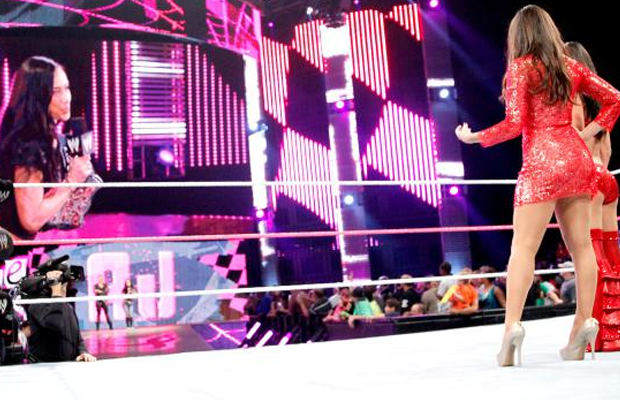 Post-match, Brie and Nikki celebrate in the ring, but AJ Lee and her enforcer Tamina come out to rain on their parade with a promo on their match at Battleground.