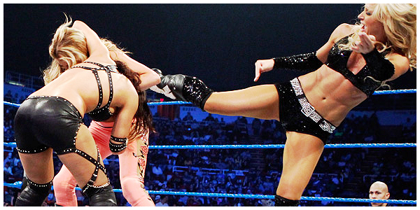 Last week on SmackDown, the Divas got a rare chance to stare alongside some of their male counterparts in various forms of backstage or ring segments. Everyone who was showcased got a chance to act and work on their character and all of them passed with flying colors. This week we were back to tag team action with Kelly Kelly teaming up with Rosa Mendes (sans jump rope) to take on Team Laycool aka Layla and Michelle McCool. Kelly and Rosa were joined by Kelly’s NXT rookie, Naomi, and Laycool were accompanied to the ring by Kaval. After the match, Laycool participated in a backstage segment that revealed which member of the team would face Melina come Sunday at Night of Champions.
