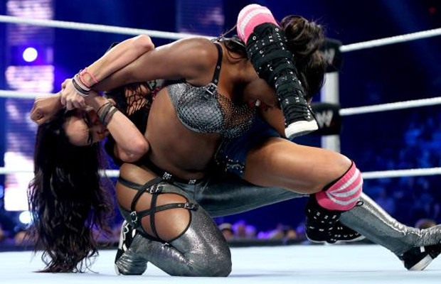AJ and Naomi go to lock up, but AJ kicks her opponent in the gut and whips her across the ring. Naomi counters with a fancy flip over the ropes, followed by a kick to the face. Naomi goes for a springboard splash next, but eats a roundhouse kick instead, for a nearfall.