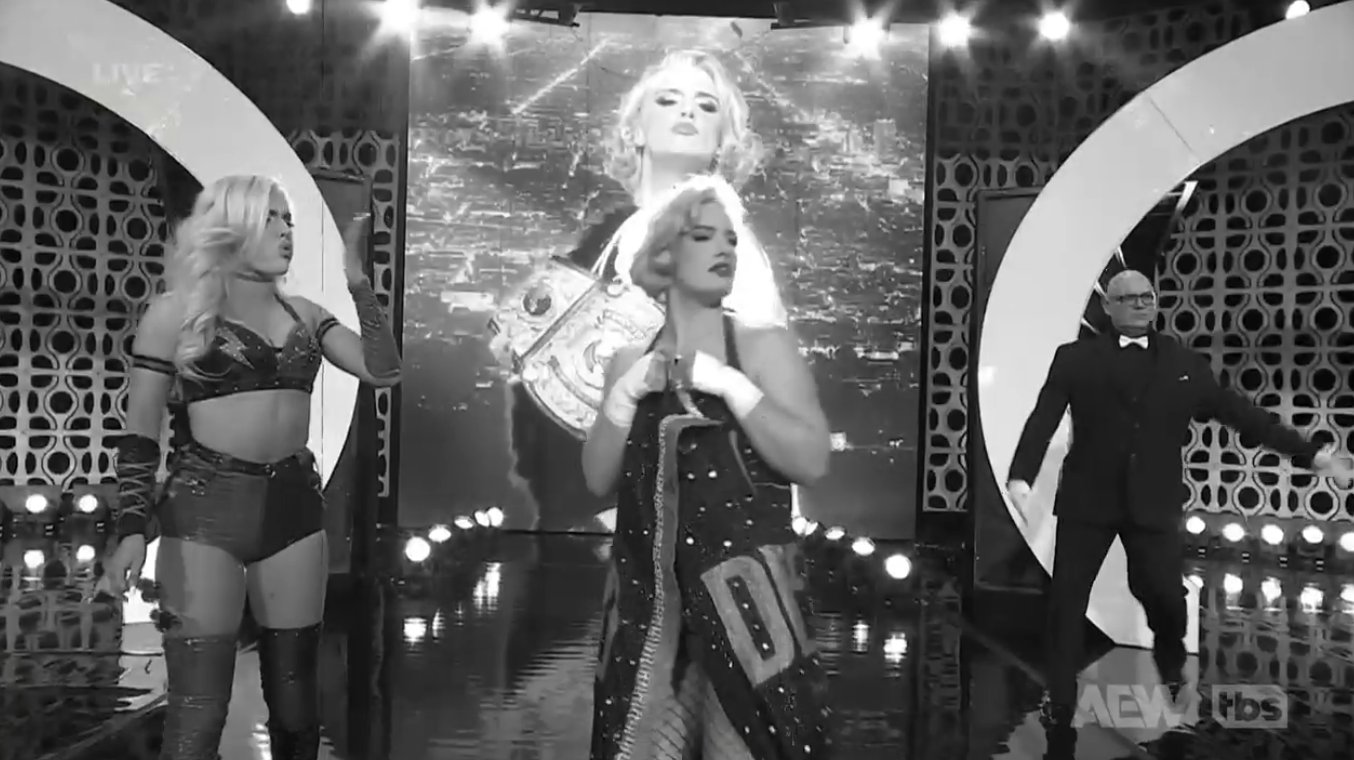 In tag-team action, AEW Women’s World Champion “Timeless” Toni Storm and her protégé Mariah May look to shut up the team of Saraya and Harley Cameron after tension brewing for some weeks now. The two teams make their entrances, and Storm is wearing the flag of Serena Deeb’s dojo, continuing to mock her from last week’s Collision.