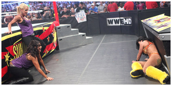 As Melina celebrates, Josh Mathews makes his way to the ring to interview the new champion, but before he can even finish his first question, he is interrupted by Lay-Cool. The BFF champs make their way to the ring to ‘share’ Melina’s special moment since they don’t have a match at SummerSlam. Not too happy about having her special moment ruined, Melina goes on the attack, taking both of the ‘Flawless Ones’ out. Unfortunately, the numbers games comes into play quickly, as Layla holds Melina in place by the feet, leaving her wide open for a vicious super kick. Alicia tries to get in on the action, but Lay-Cool attacks her as well. Lay-Cool toss Melina to the floor and McCool levels Melina with a vicious knee to the head, ending our SummerSlam Divas segment.