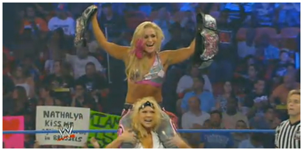 After clearing house of Lay-Cool — exclaimed by a Glam Slam on Layla — Beth raised Natalya high on her shoulders as the new champion showed off her newly won championship. A real sight to be seen and a beautiful, tender moment as both Natalya and Beth were in tears.