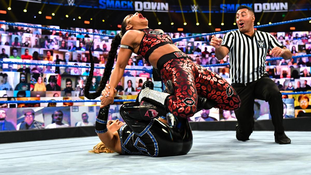Carmella would then get caught from her superkick and Banks delivered a knee into a jackknife for a near fall. Reginald gets involved one last time as he hops back on the apron and Banks delivered a punch to knock him off. She turns around into a facebuster for Carmella to pick up the three count and the win. Carmella has pinned the SmackDown Women’s Champion.
