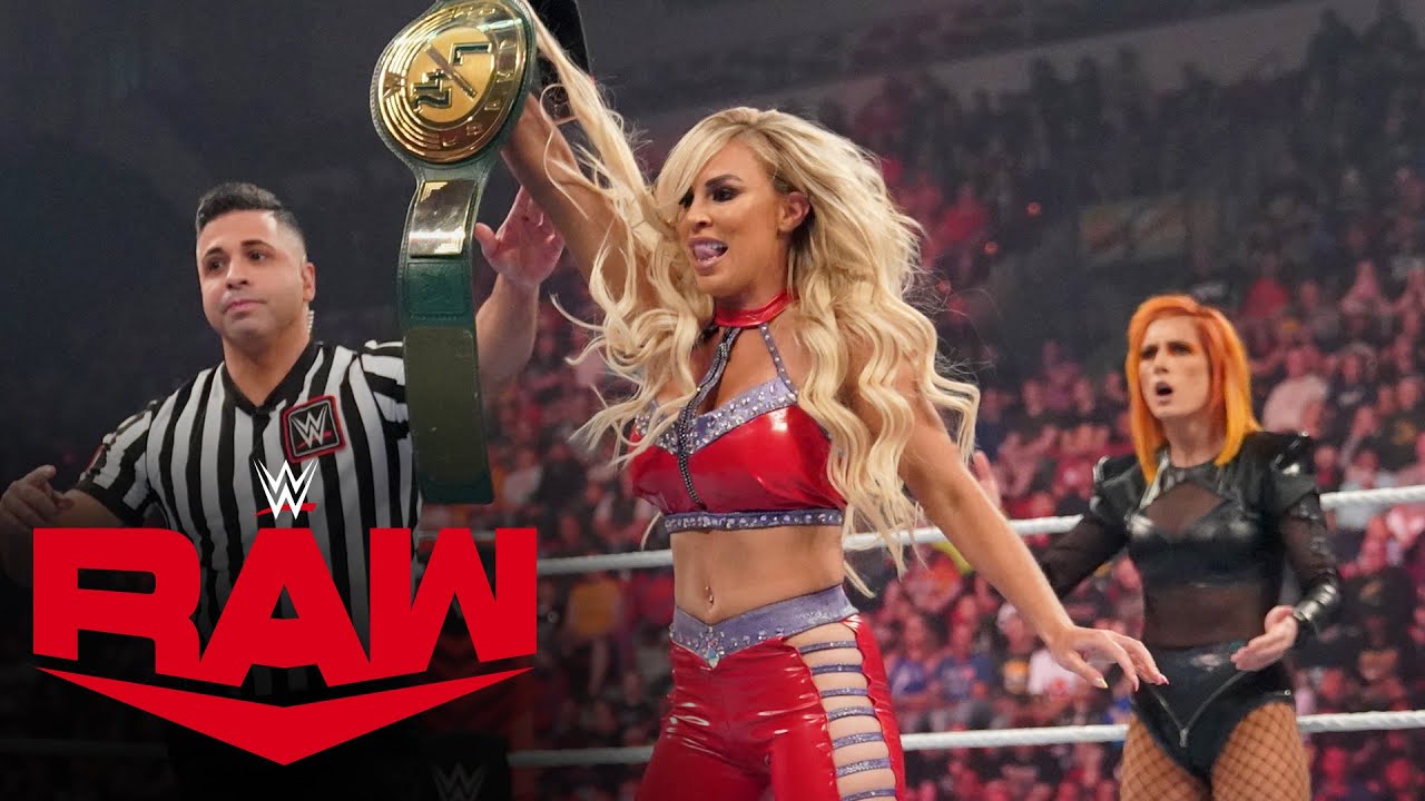 Moments later, Lynch’s music hits again much to Stratus’ confusion as that wasn’t the plan. This time Becky was back and she was behind Trish in the ring. Lynch delivered a ManHandle slam which made Stratus roll out the ring and retreat up the ramp.
