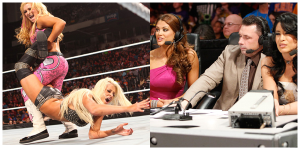 Out first to the ring first is Maryse, who’s looking fantastic. During her entrance, Cole introduces Eve and an oddly silent Milena, who are ringside on commentary. Next out is Natalya, who practically runs to the ring. Are we short on Diva time already? In the meantime, Cole uses his journalistic prowess to get to the bottom of the issues between Melina and Natalya and is rewarded with icy cold silence from the #1 Contender. Awkward… Cutting his losses, Cole turns his questioning to Eve and brings up the tag match two weeks ago that saw Eve pick up the win over Melina. Eve smoothly deflects the question by talking about thrilled she is to be at ringside for this match. Sure you are…