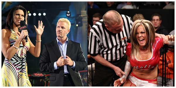 FINALLY! A show that starts out with the TNA Knockouts, pretty much all of which are in the ring when the show hits the air. It seems we’re in the middle of Karen Jarrett, lining them up and going down the line, one by one. She starts out with someone who appears to be the TNA seamstress, given the measuring tape over her shoulder and her statement of getting his measurements. Karen, being the ever so witty one, tells her to take her dancing fingers and dance them out of the ring. After that line, I’m pretty sure Karen should just be revoked from ever speaking on the microphone. Ever.
