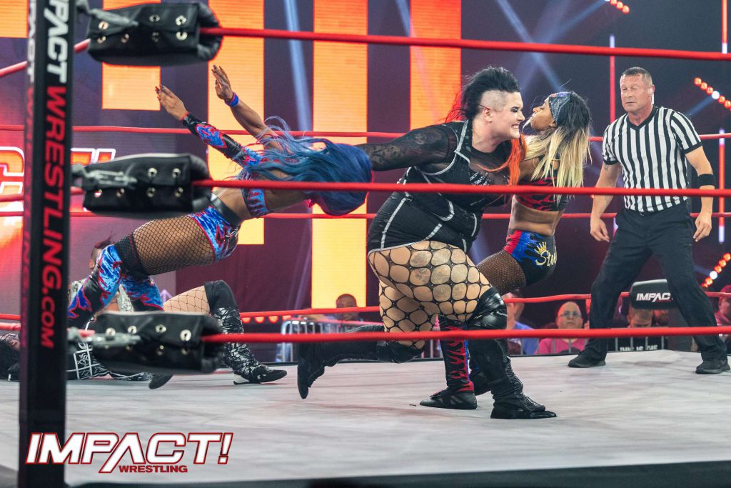 With Kiera Hogan and Tasha Steelz attempting to become three-time Knockouts Tag Team Champions, the pressure was on. Hogan mistakenly superkicks Steelz at the end of the match which allowed Decay to hit their finisher. Decay retains.