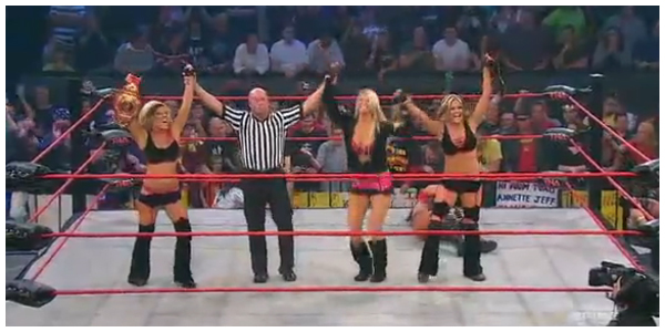 The new tag team champions, The Beautiful People (Madison Rayne and Velvet Sky) defeated Saritaylor and the team of Tara and Angelina Love in a triple threat tag team match to win the belts.