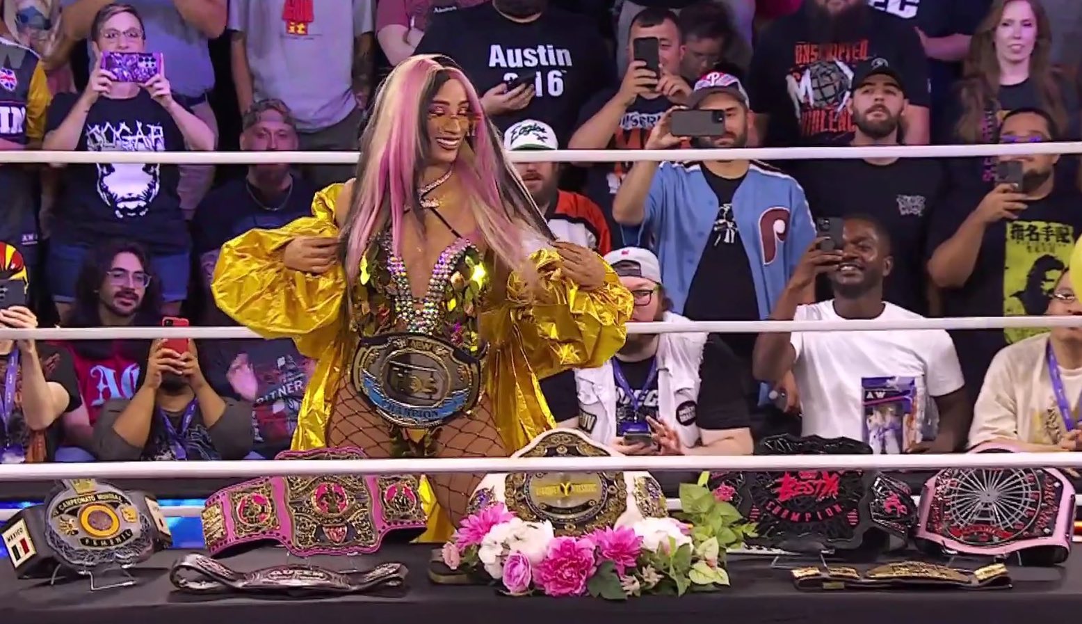 “The CEO” Mercedes Moné is in the 2300 Arena tonight as she addresses her successful TBS Championship defense at Forbidden Door. With nine belts on display, she’s looking for her 10th one, just like the Ultimo Dragon once had, but this time, she wants to smash that record. And, if Alex Windsor wants another chance at the TBS title, then “The CEO” promises to beat her senseless.