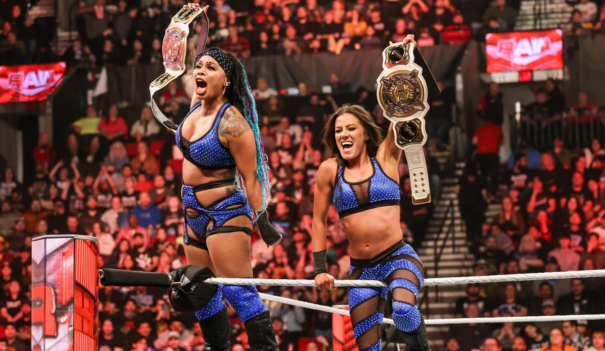 Kayden Carter and Katana Chance are still the WWE Women’s Tag Team Champions after a hard fought battle against former champions Chelsea Green and Piper Niven. During this match the tag teams of Raw were watching backstage.