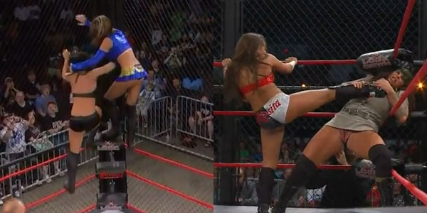 Sky tries to drag Gail into the center of the ring, but Kim fights off and begins to scale the cage. This sparks Velvet to follow her up and signal for a top rope In Yo Face! Gail counters out and tries to flip Velvet over, but Sky holds on and hits a huge powerbomb! Madison seems to be in shock, as Sky goes for the cover and Gail grabs onto the ropes. Suddenly, Velvet is distracted with Madison and goes for her, but catches Gail as she tries to escape. Sky with a roll up, but Gail reverses it and grabs Velvet’s skirt to retain her title. Velvet fans will have to wait another day it seems.