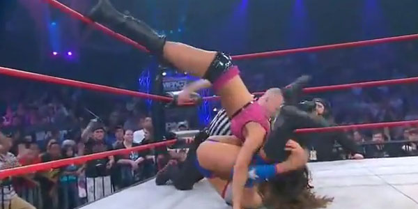 A series of clotheslines strike with Tessmacher then hitting a huge faceplant out of the corner! She does a little Sarita salsa dance briefly, before heading to the top rope and LEAPING off with a huge elbow drop! Only a two count for Tessmacher, but the crowd is still rooting for the asstastic female from Houston. Brooke sets up for the Tess-Shocker, but no avail. Kim then goes for the Eat Defeat, but Brooke counters out and hits the Eat Defeat herself! A “Yes” chant breaks out, as Brooke slides Gail in and goes for the cover. Too much time was wasted though, as Gail kicks out. Brooke tries to keep the momentum in her favor, but Gail quickly rolls her up and uses the ropes to retain her title.