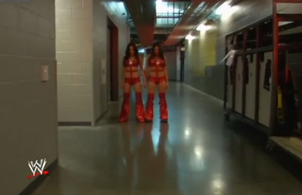 Brie and Nikki pull a perfect imitation of The Shining‘s evil twins, confronting Hornswoggle in a deserted hallway.